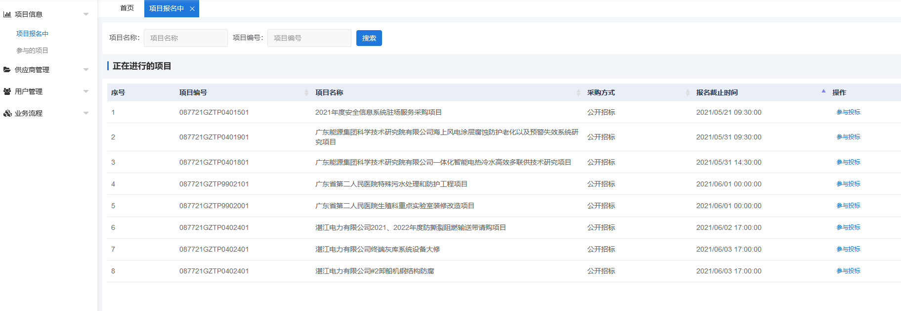 1、供應商進入系統后,展開“項目信息→項目報名中”菜單。如下圖所示,可以看到目前可投標的項目情況。