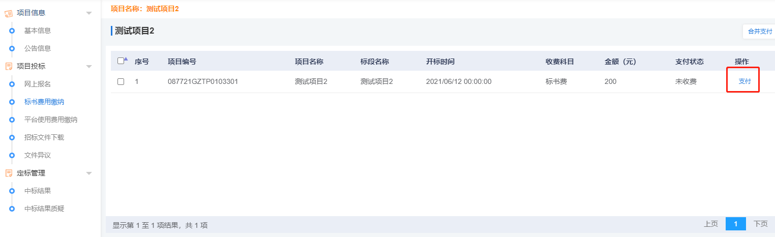 1、點擊左側“標書費用繳納”,再點擊右側“費用支付”則可進行線上支付,暫時僅支持支付寶支付。