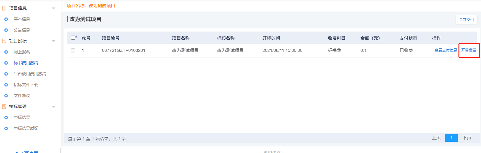 在繳納標書費用后可點擊“開具發票”進行填寫發票開具信息。