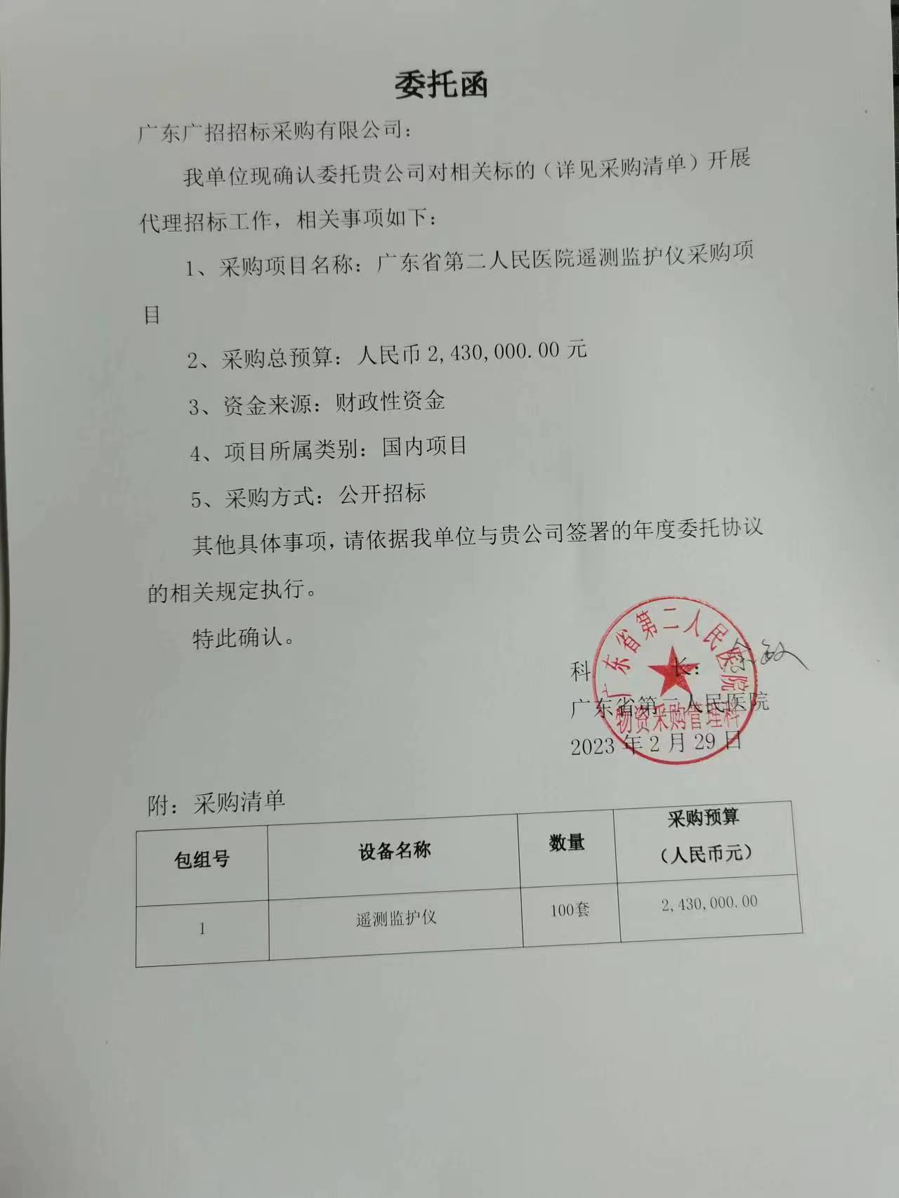 廣東省第二人民醫院遙測監護儀采購項目(二次)招標項目的潛在投標人應在廣東省政府采購網https://gdgpo.czt.gd.gov.cn/獲取招標文件,并于 2023年05月12日 09時30分 (北京時間)前遞交投標文件。