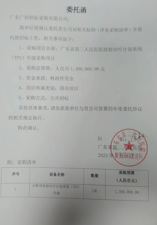 廣東省第二人民醫院放射治療計劃系統(TPS)升級采購項目招標項目的潛在投標人應在廣東省政府采購網https://gdgpo.czt.gd.gov.cn/獲取招標文件,并于 2023年08月07日 09時30分 (北京時間)前遞交投標文件。
